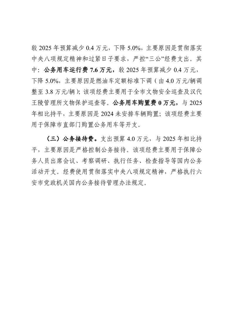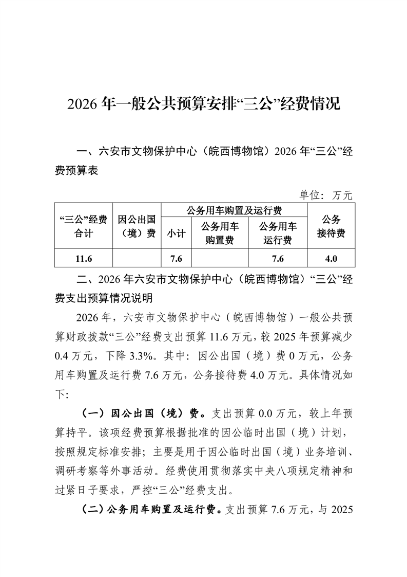 六安市文物保护中心(皖西博物馆)单位2026年一般公共预算安排“三公”经费情况