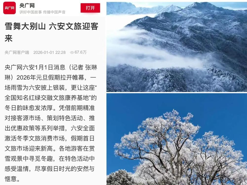 宣传矩阵强势破圈。市县联动构建“官方账号统筹+景区特色发力+推广大使联动”的立体宣传矩阵,累计发布视频、新闻报道百余条,持续推送大别山雾凇冰挂、冬日温泉等特色内容,《雪舞大别山六安文旅迎客来》推文登载央广网,浏览量突破80万+,有效撬动长三角核心客源市场。