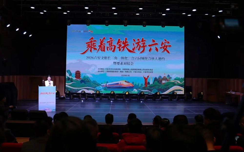 高铁飞驰架金桥,文旅携手向未来。1月9日下午,“乘着高铁游六安”——2026六安文旅长三角一体化、合六同城化合伙人邀约暨要素对接会在六安市文化馆一楼小剧场隆重召开。本次大会以铁路交通为纽带,以要素对接为抓手,以合作共赢为目标,汇聚政企多方力量,共商文旅发展大计,为六安文化旅游业高质量发展注入强劲动能,也标志着六安在推动长三角文旅一体化、深化合六同城化发展进程中迈出了坚实步伐。