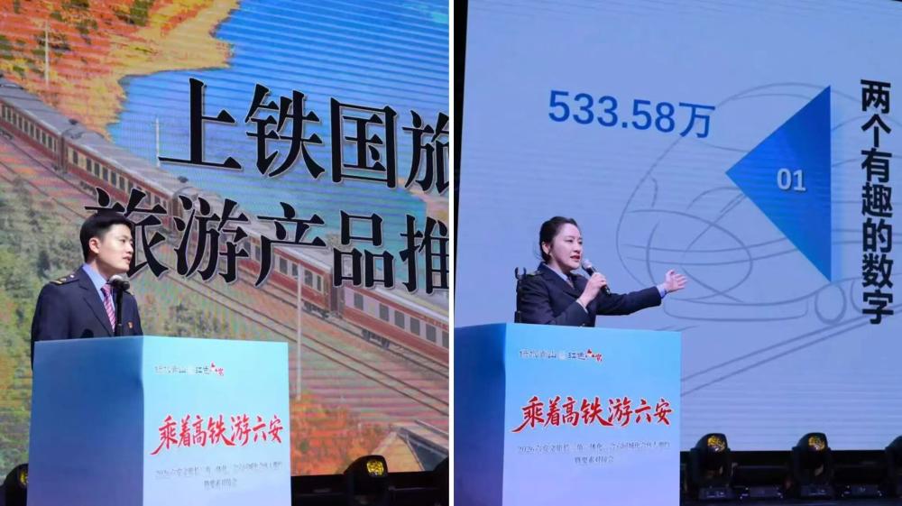 本次大会由六安市文旅局与中国铁路上海局集团有限公司合肥车务段联合主办,上海铁路国际旅游(集团)有限公司、六安火车站、六安市文化馆共同承办,得到政府部门、交通企业、文旅机构及主流媒体的广泛关注与大力支持。活动现场,暖场宣传片《大别天下 何以六安》生动展现了六安的山水之美、人文之韵与发展活力,瞬间点燃全场热情。