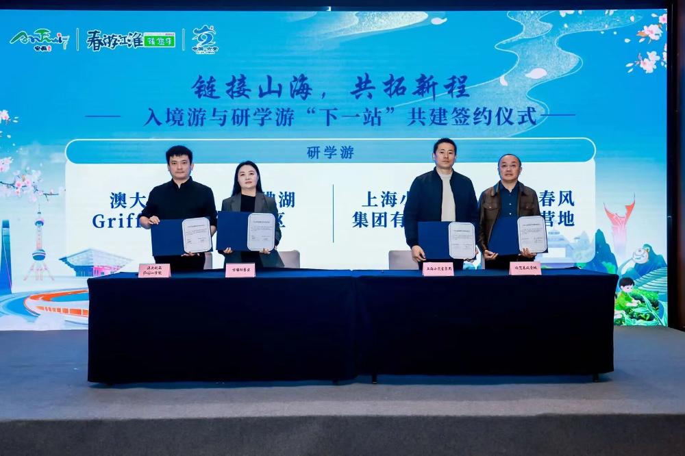 活动现场,“链接山海,共拓新程”入境游与研学游“下一站”共建签约环节成为焦点。万佛湖景区、迎驾春风研学营地分别与格里芬教育集团、上海小荧星集团两家头部研学机构代表签订战略合作协议;天堂寨景区、安徽省喜欢旅行国际旅游公司与上海携程商务有限公司代表签订战略合作协议。