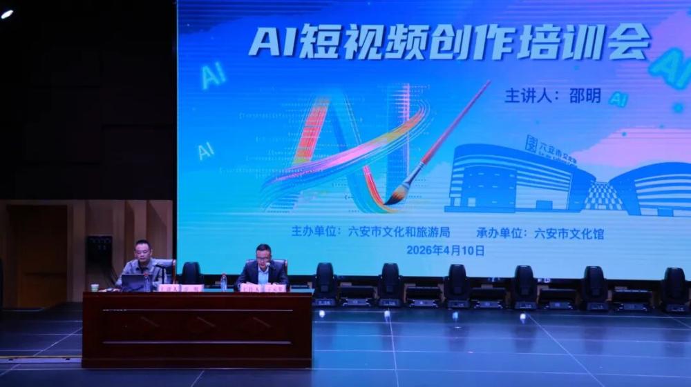 4月10日,六安市2026年第4期“文旅大讲堂”在市文化馆小剧场正式开讲。本次活动由六安市文化和旅游局主办、六安市文化馆承办,聚焦人工智能技术与文旅宣传深度融合主题,特邀六安市毛坦厂中学东城校区邵明、市新闻传媒中心胡冠菊两位嘉宾带来专题分享,助力全市文旅系统提升数字化创新实践能力。