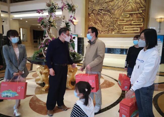 4月15日,金寨迎来了4位援鄂医务工作人员,游客来自安庆。他们从媒体上获知金寨开展的暖心活动,再加上久闻天堂寨的美名,就各自带上家人来了金寨。入住的鸿福花园粤海酒店在免住宿费的基础上,每天膳食还为他们赠送了1只金寨土鸡。金寨文旅体育局的工作人员在核对了游客的信息后,特意赶去为每人赠送了1份金寨旅游长寿产品大礼包。