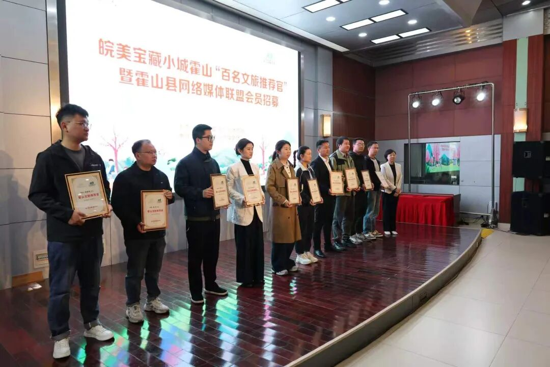 仪式上,迎驾慈善基金会与县文旅局完成捐赠签约,以实际行动支持家乡文旅发展。县委常委、宣传部部长朱静为现场10名文旅推荐官代表颁发证书,鼓励大家讲好霍山故事。县文旅局先后发布2026年重点文旅体活动及“百名文旅推荐官”招募计划,县餐饮协会、县乡村振兴公司、霍山邮政分公司分别推介霍山特色美食与“霍山有礼”文旅伴手礼,全方位展现霍山文旅魅力。